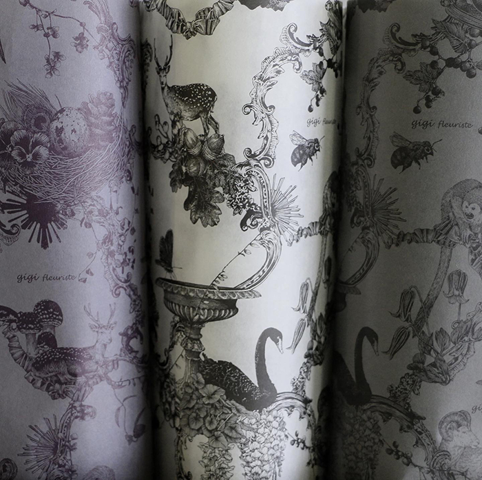 私が感じた辻さんの世界観をめいいっぱいラッピングペーパーの上に広げました。花を引き立てるためだけのものではなく、花束を作品にするためのラッピングペーパーにしたいと思いました。